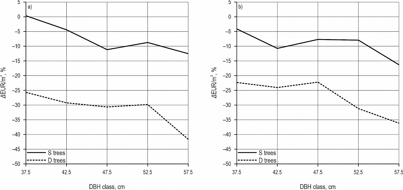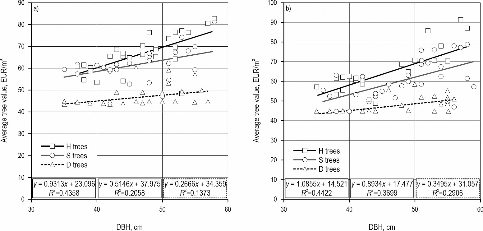 Fig. A3 Regression of average tree value (EUR/m3) and diameter at breast height (cm) for: a) silver fir, b) Norway spruce